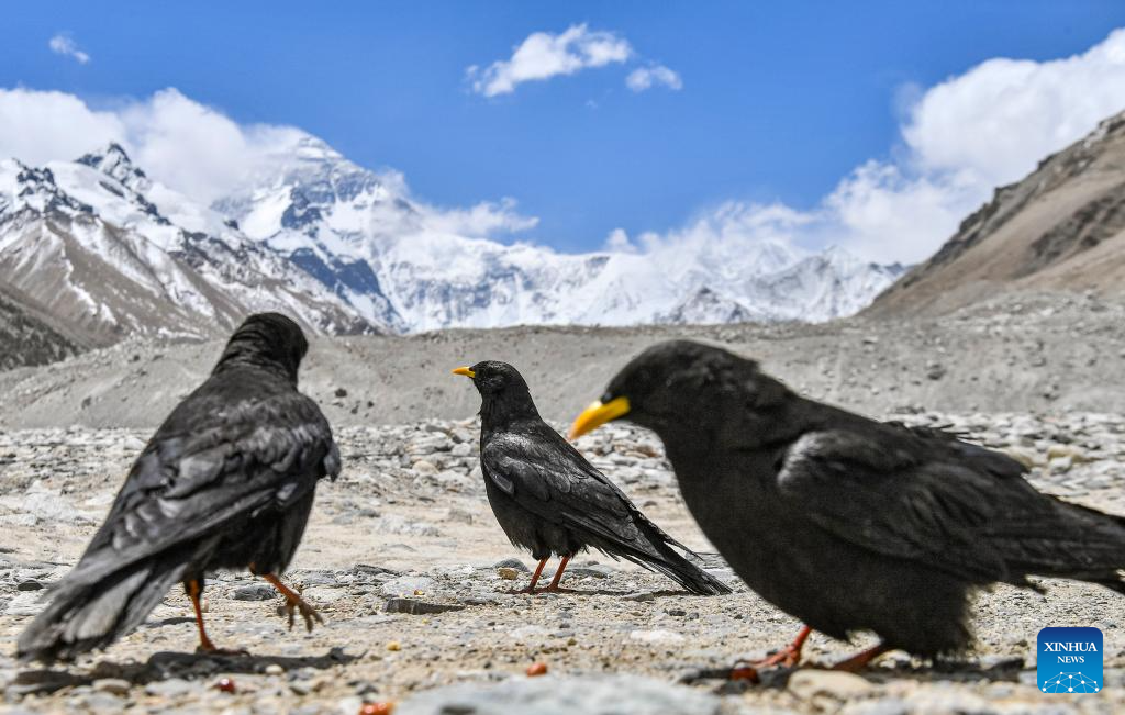 This photo taken on May 14, 2023 shows yellow-billed choughs at the foot of Mount Qomolangma in southwest China's Tibet Autonomous Region.?(Xinhua/Jigme Dorje)