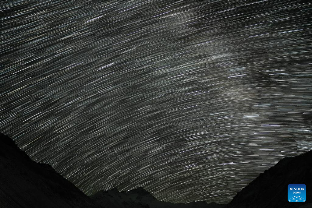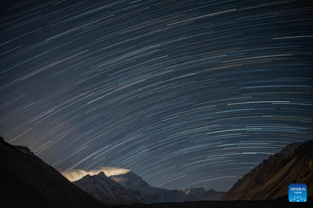 This composite photo taken on May 10, 2023 shows star trails above the Mount Qomolangma base camp in southwest China's Tibet Autonomous Region. (Xinhua/Sun Fei)
