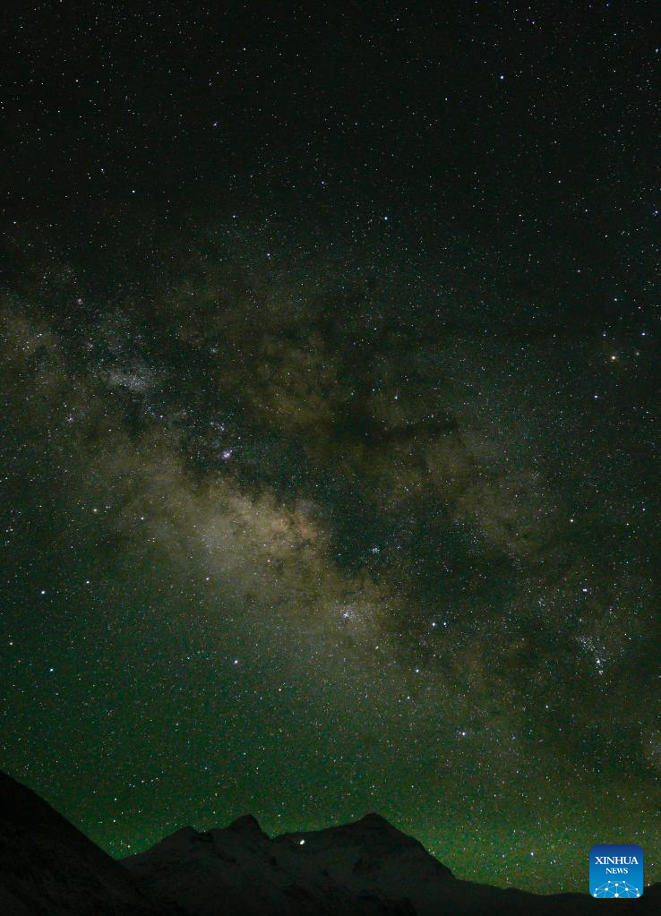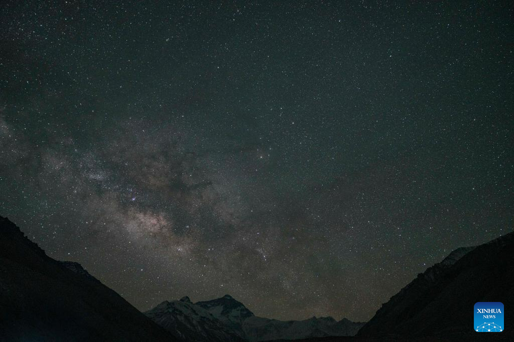 This photo taken in the early morning of May 12, 2023 shows the galaxy above Mount Qomolangma, in southwest China's Tibet Autonomous Region. (Xinhua/Sun Fei)