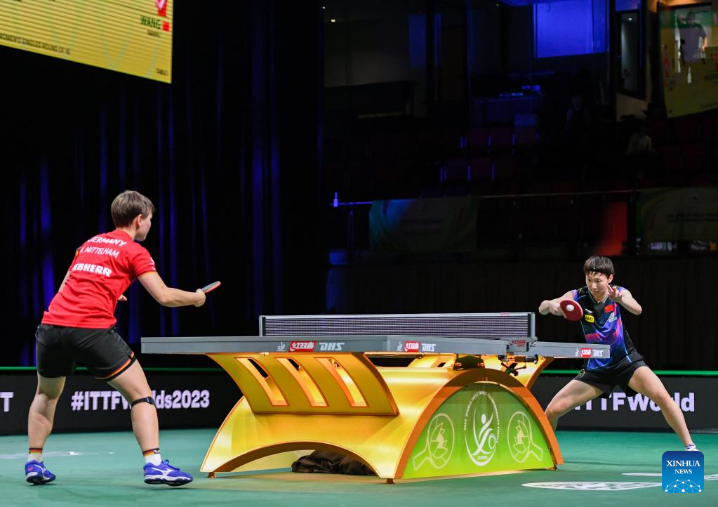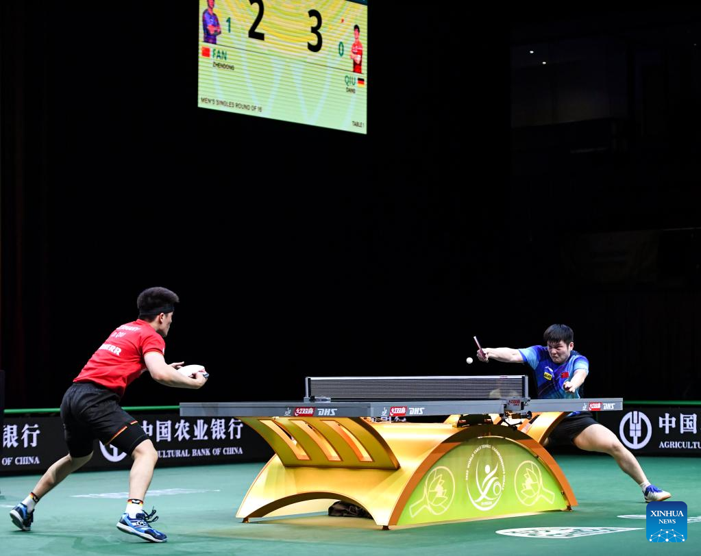Qiu Dang of Germany hits a return during the men's singles round of 16 match against Fan Zhendong of China at 2023 ITTF Table Tennis World Championships Finals in Durban, South Africa, May 25, 2023. (Xinhua/Li Yahui)