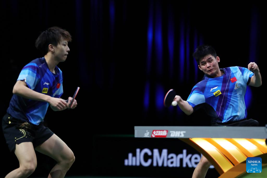 Lin Shidong/Kuai Man(L) of China compete during the mixed doubles semifinal match against Harimoto Tomokazu/Hayata Hina of Japan at 2023 ITTF Table Tennis World Championships Finals in Durban, South Africa, May 25, 2023. (Xinhua/Tao Xiyi)