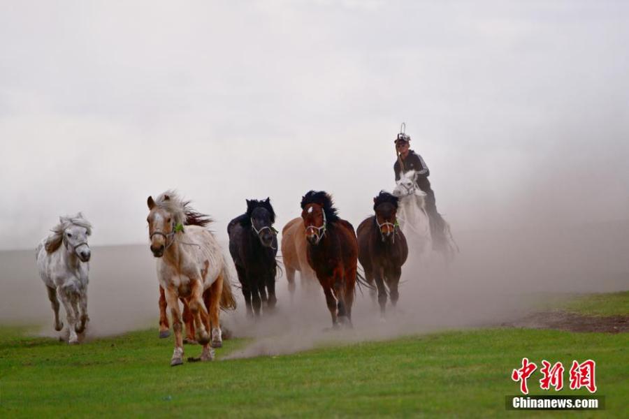 A herdsman drives horses on a grassland in Ergun, Hulun Buir City, north China's Inner Mongolia Autonomous Region. It's a spectacular scene watching horses race across the grasslands, a huge appeal for tourists and photographers. (Photo: China News Service/Yu Hai)
