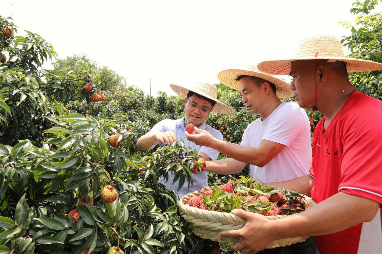 Liu Zhanliang (L), mayor of Xiuying district, Haikou city in south China's Hainan Province, checks on the growth of lychees with lychee growers. (Photo courtesy of the publicity department of the Communist Party of China Xiuying district committee)