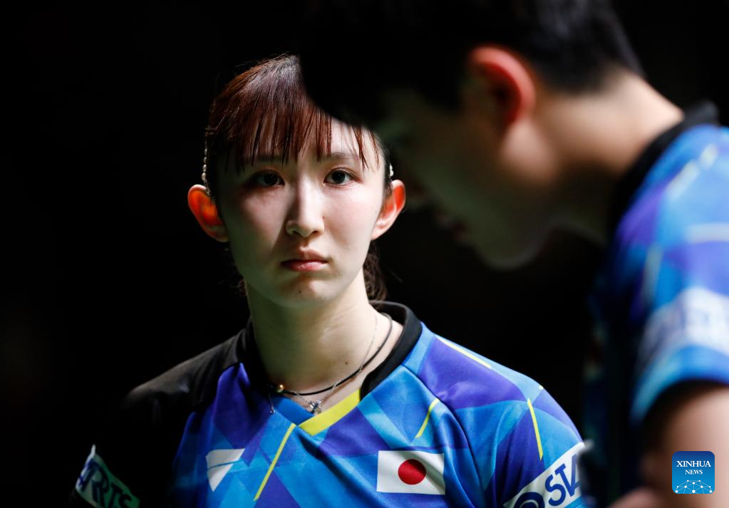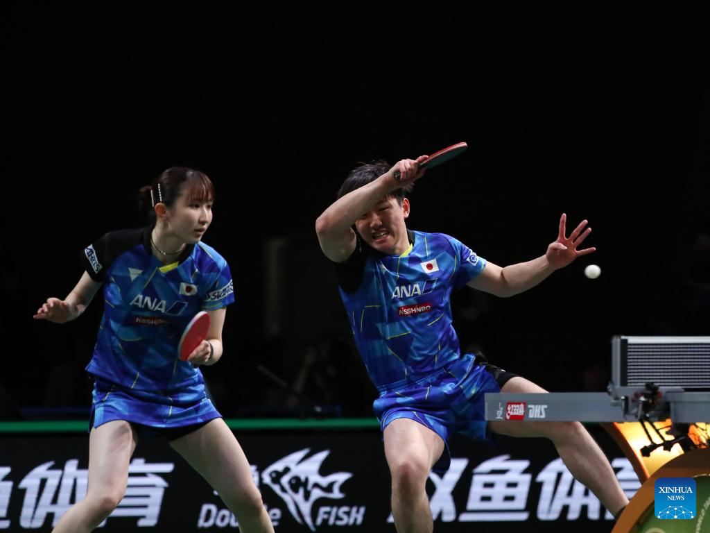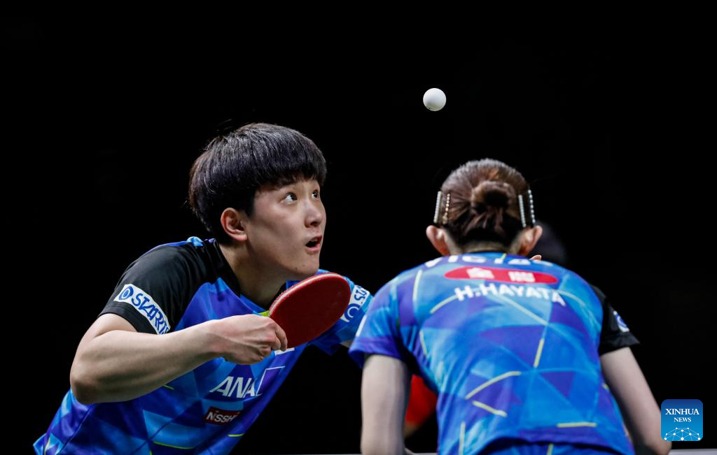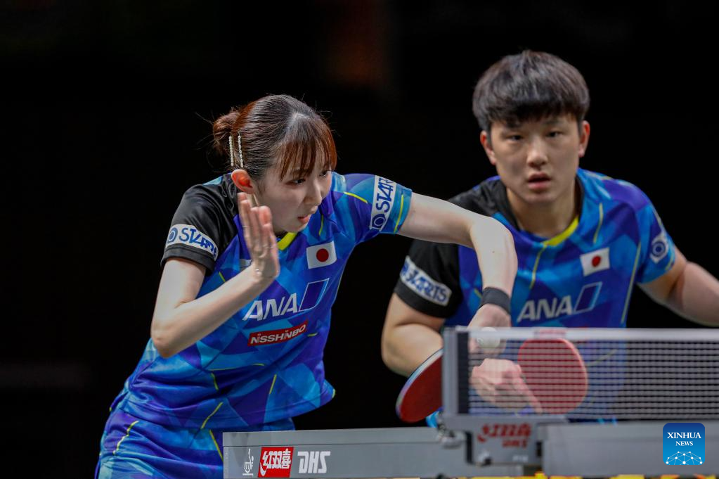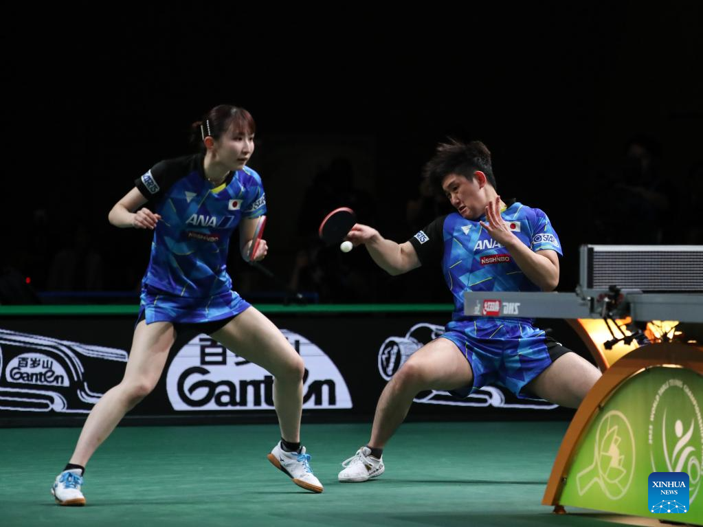 Harimoto Tomokazu (R)/Hayata Hina of Japan compete during the mixed doubles final match against Wang Chuqin/Sun Yingsha of China at 2023 ITTF Table Tennis World Championships Finals in Durban, South Africa, May 26, 2023. (Xinhua/Han Xu)