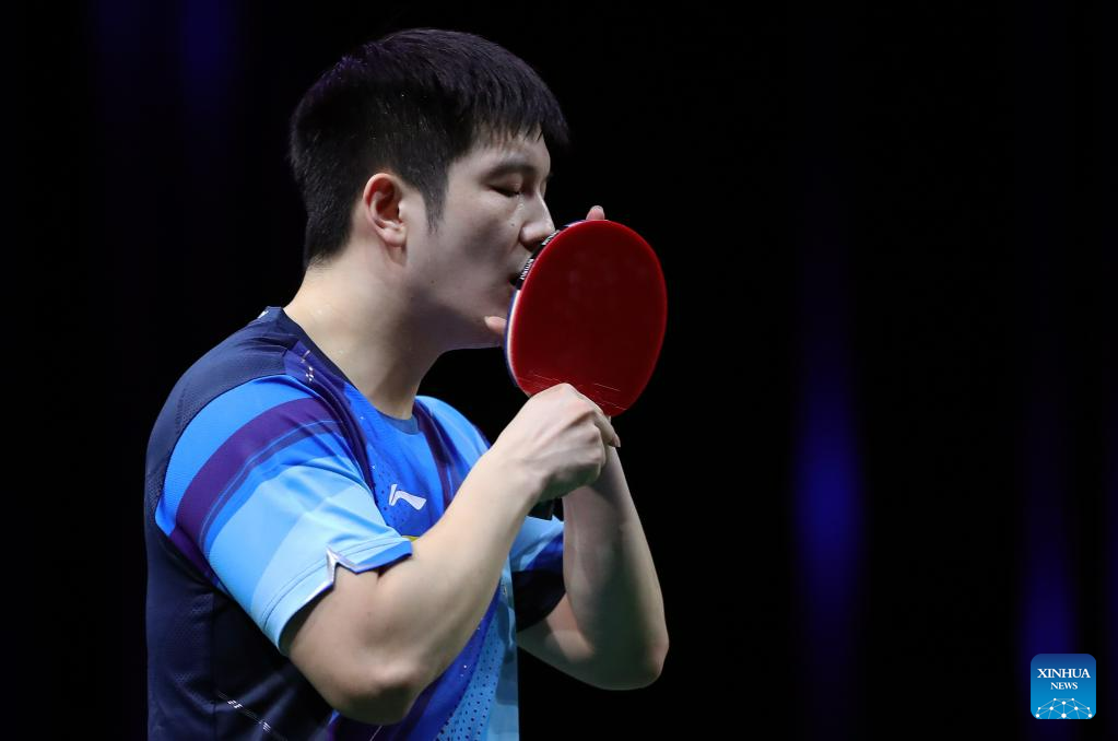 Fan Zhendong of China reacts during the men's singles quarterfinal against Omar Assar of Egypt at 2023 ITTF Table Tennis World Championships Finals in Durban, South Africa, May 26, 2023. (Xinhua/Wang Dongzhen)