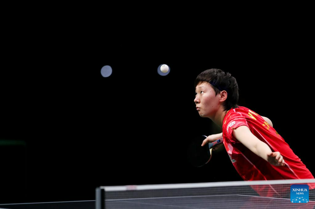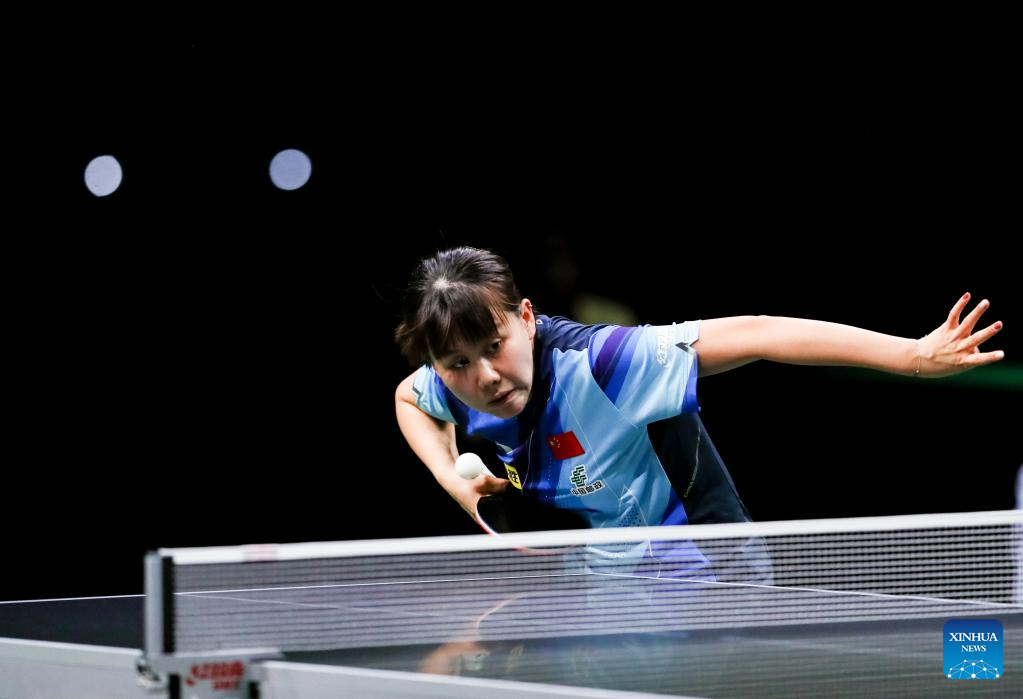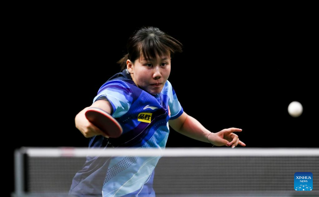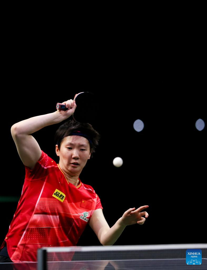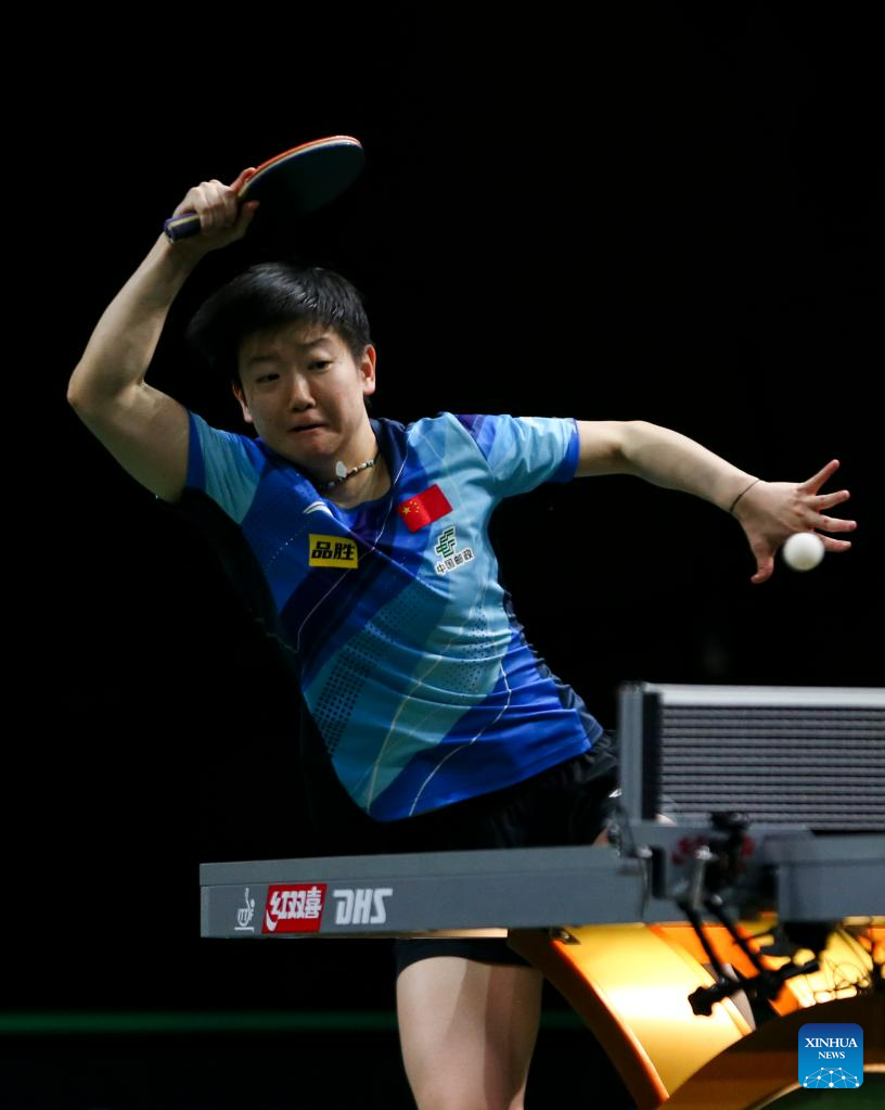 Wang Manyu of China hits a return during the women's singles quarterfinal against her teammate Chen Xingtong at 2023 ITTF Table Tennis World Championships Finals in Durban, South Africa, May 26, 2023. (Xinhua/Zhang Yudong)