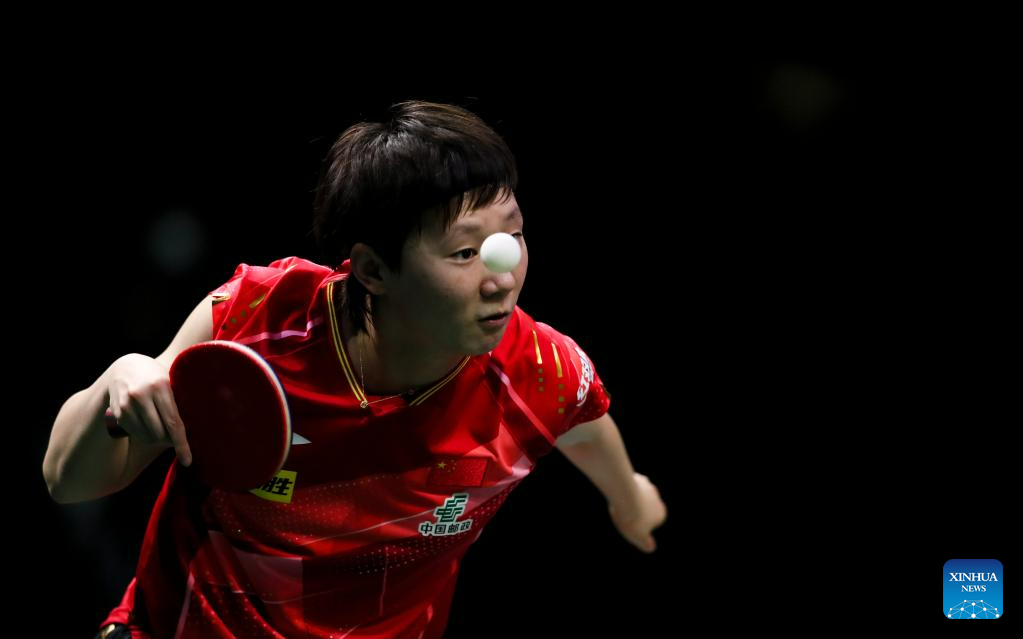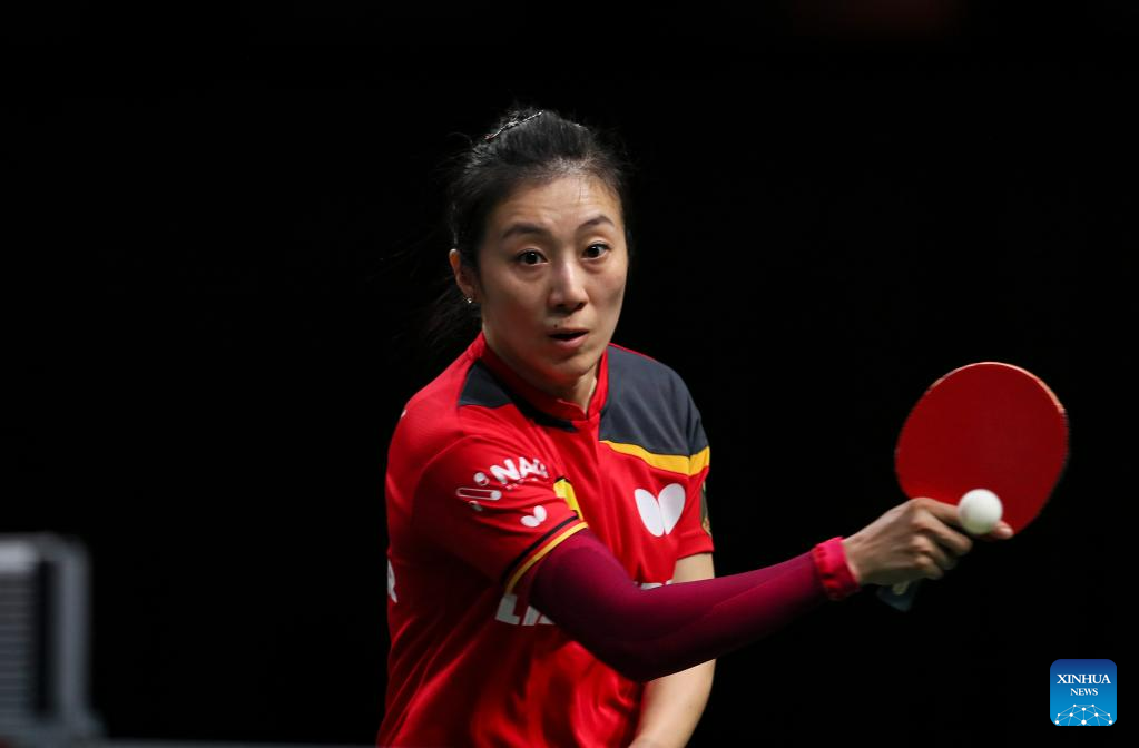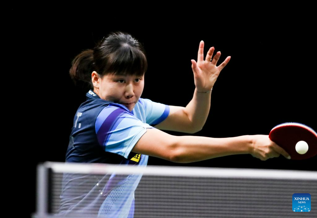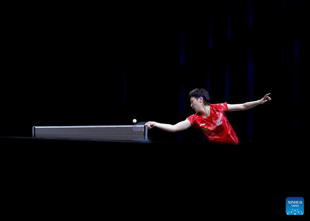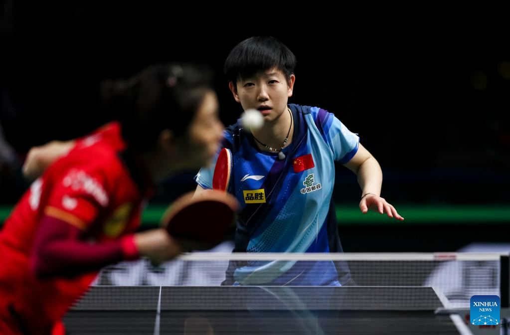 Wang Manyu of China hits a return during the women's singles quarterfinal against her teammate Chen Xingtong at 2023 ITTF Table Tennis World Championships Finals in Durban, South Africa, May 26, 2023. (Xinhua/Zhang Yudong)