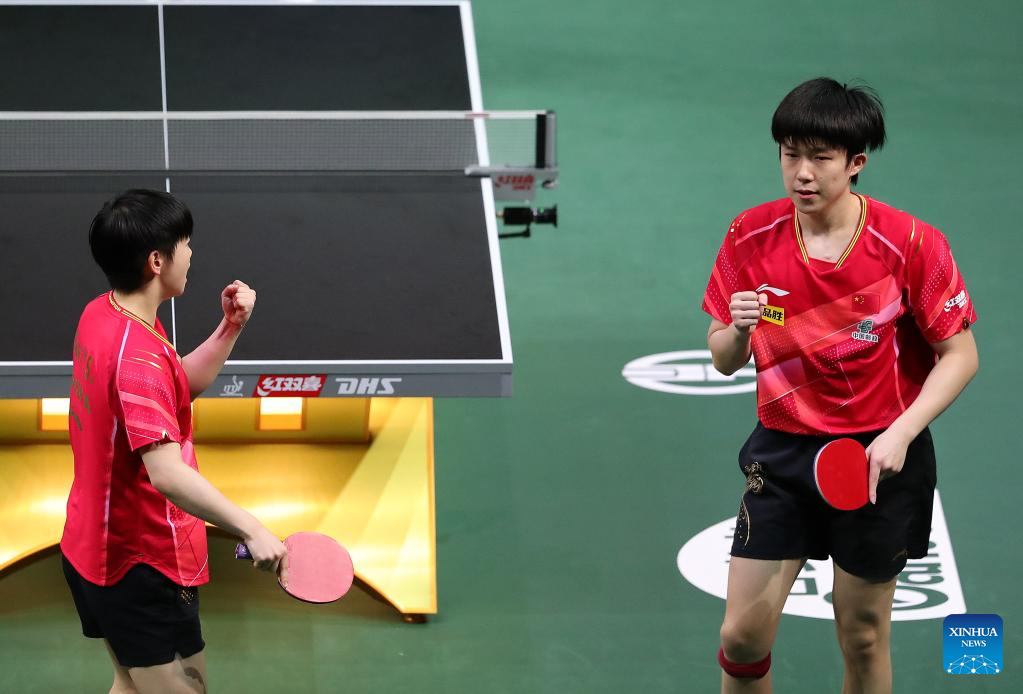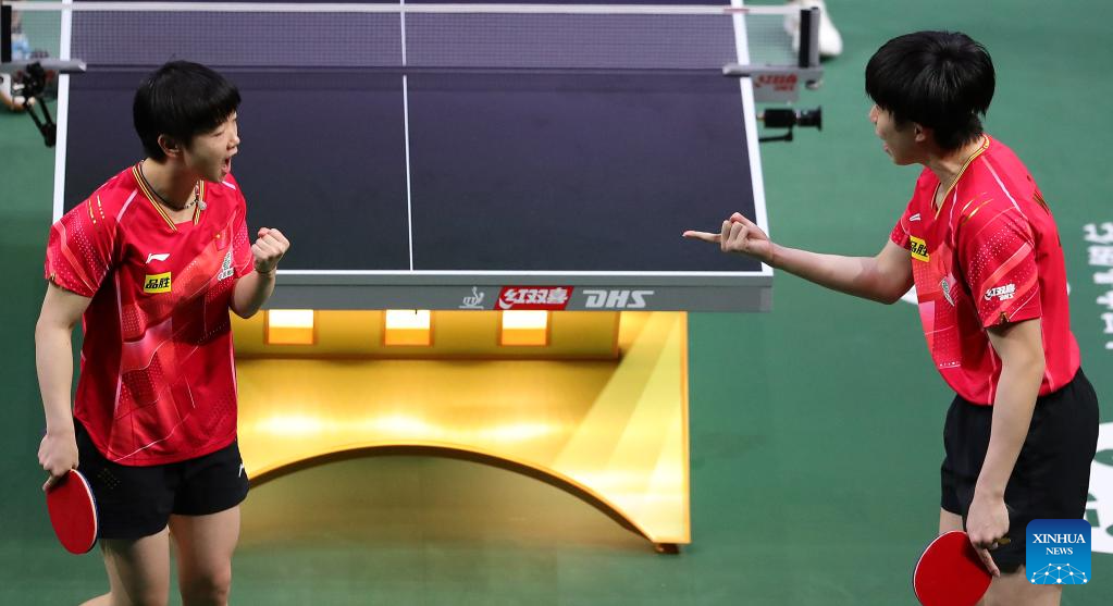 Wang Chuqin/Sun Yingsha (L) of China celebrate during the mixed doubles final match against Harimoto Tomokazu/Hayata Hina of Japan at 2023 ITTF Table Tennis World Championships Finals in Durban, South Africa, May 26, 2023. (Xinhua/Wang Dongzhen)