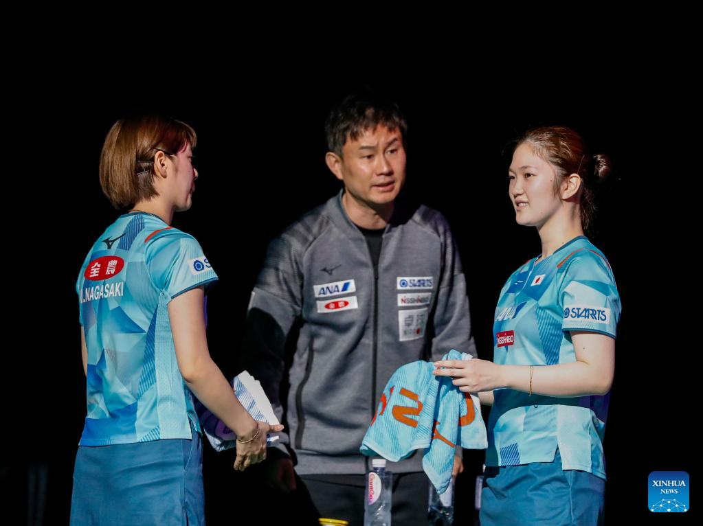 Kihara Miyuu (R)/Nagasaki Miyu (L) of Japan talk to their coach during the women's doubles semifinal against Chen Meng/Wang Yidi of China at 2023 ITTF Table Tennis World Championships Finals in Durban, South Africa, May 26, 2023. (Xinhua/Li Yahui)
