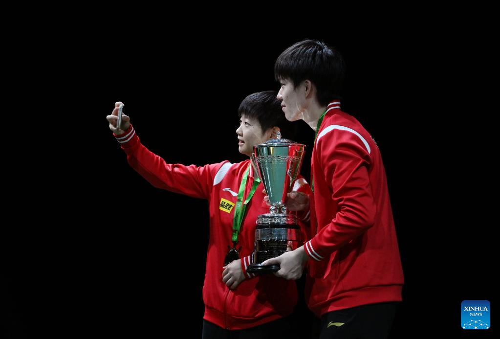 First-placed Wang Chuqin (R)/Sun Yingsha of China take a selfie with the trohpy during the mixed doubles awarding ceremony at 2023 ITTF Table Tennis World Championships Finals in Durban, South Africa, May 26, 2023. (Xinhua/Tao Xiyi)