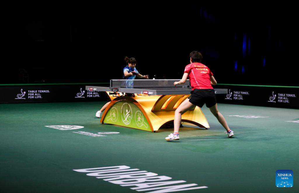 Chen Xingtong (L) of China hits a return during the women's singles quarterfinal against her teammate Wang Manyu at 2023 ITTF Table Tennis World Championships Finals in Durban, South Africa, May 26, 2023. (Xinhua/Zhang Yudong)