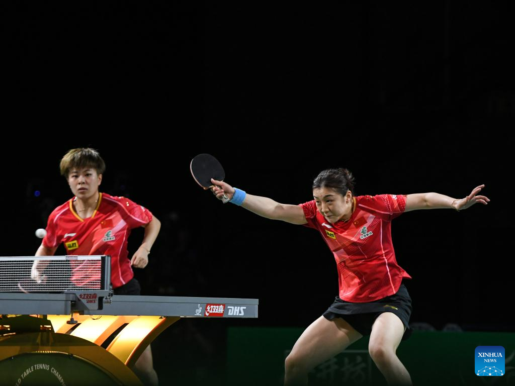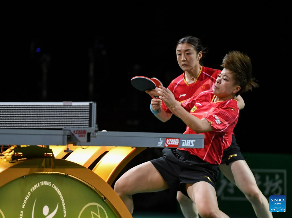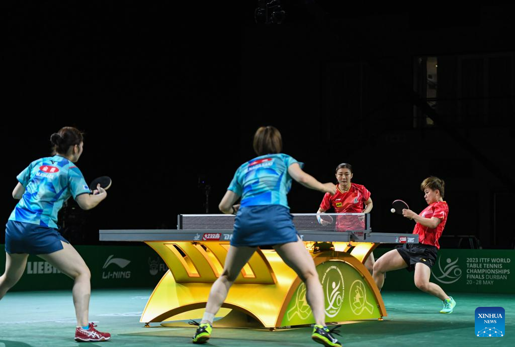 Chen Meng (L)/Wang Yidi of China compete during the women's doubles semifinal against Kihara Miyuu /Nagasaki Miyu of Japan at 2023 ITTF Table Tennis World Championships Finals in Durban, South Africa, May 26, 2023. (Xinhua/Li Yahui)