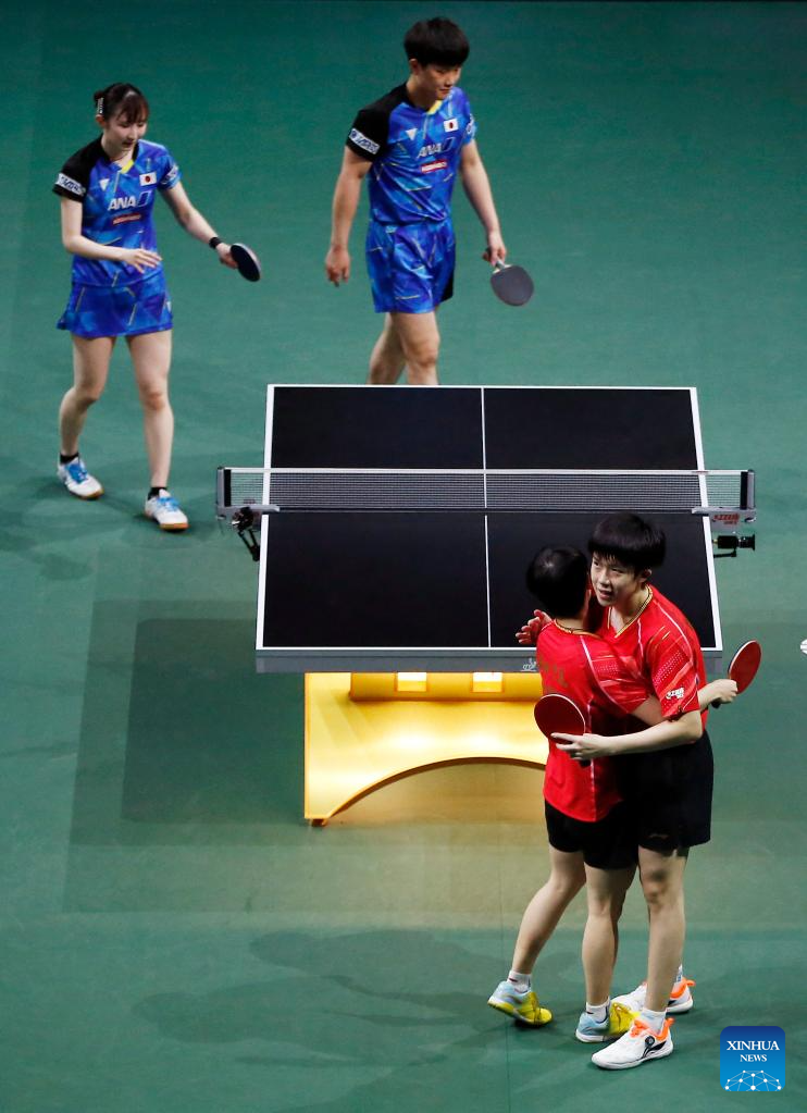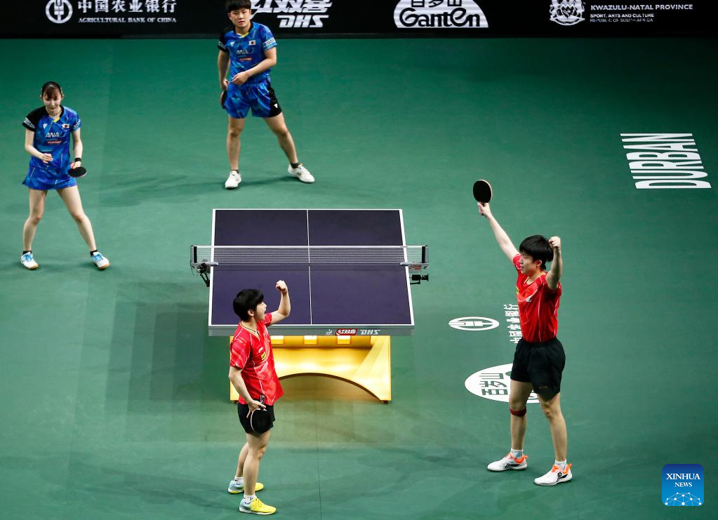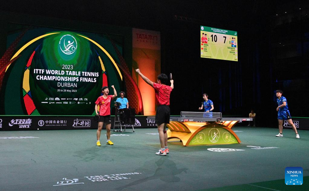 Wang Chuqin/Sun Yingsha (R) of China celebrate after winning the mixed doubles final match against Harimoto Tomokazu/Hayata Hina of Japan at 2023 ITTF Table Tennis World Championships Finals in Durban, South Africa, May 26, 2023. (Xinhua/Li Yahui)
