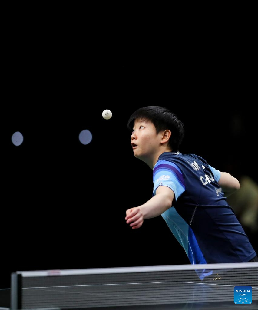 Chen Xingtong of China hits a return during the women's singles quarterfinal against her teammate Wang Manyu at 2023 ITTF Table Tennis World Championships Finals in Durban, South Africa, May 26, 2023. (Xinhua/Zhang Yudong)