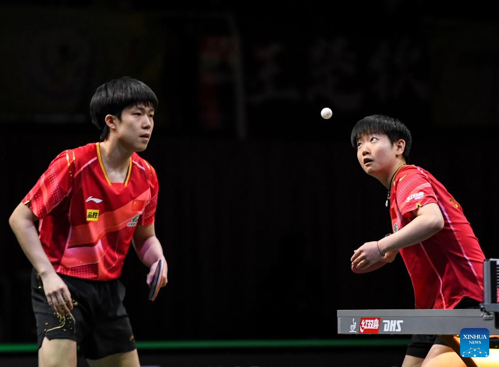 Wang Chuqin/Sun Yingsha (R) of China compete during the mixed doubles final match against Harimoto Tomokazu/Hayata Hina of Japan at 2023 ITTF Table Tennis World Championships Finals in Durban, South Africa, May 26, 2023. (Xinhua/Li Yahui)