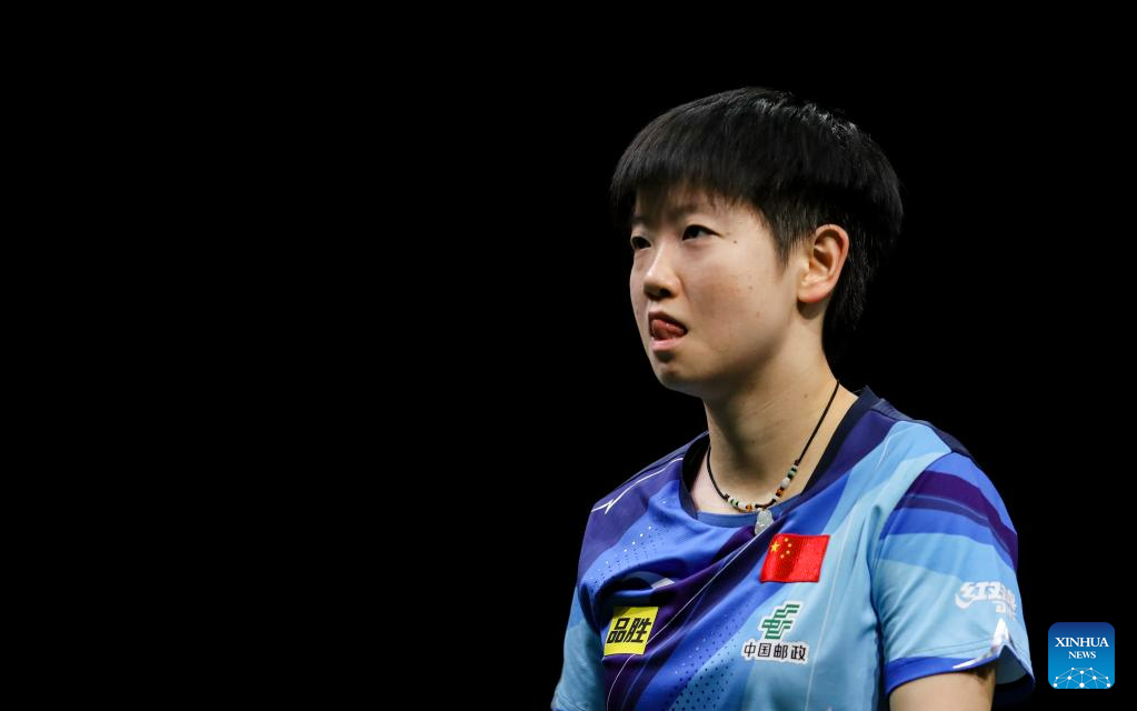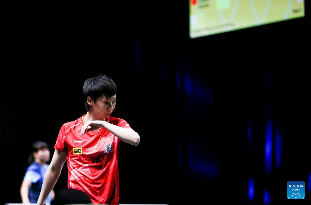 Sun Yingsha of China reacts during the women's singles quarterfinal against Han Ying of Germany at 2023 ITTF Table Tennis World Championships Finals in Durban, South Africa, May 26, 2023. (Xinhua/Zhang Yudong)