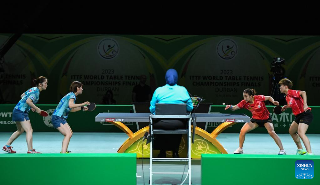 Chen Meng(R)/Wang Yidi of China compete during the women's doubles semifinal against Kihara Miyuu /Nagasaki Miyu of Japan at 2023 ITTF Table Tennis World Championships Finals in Durban, South Africa, May 26, 2023. (Xinhua/Li Yahui)