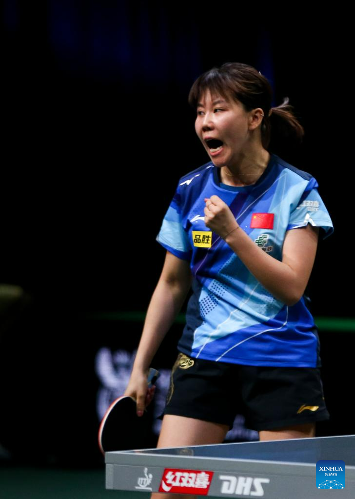 Wang Manyu of China reacts during the women's singles quarterfinal against her teammate Chen Xingtong at 2023 ITTF Table Tennis World Championships Finals in Durban, South Africa, May 26, 2023. (Xinhua/Zhang Yudong)