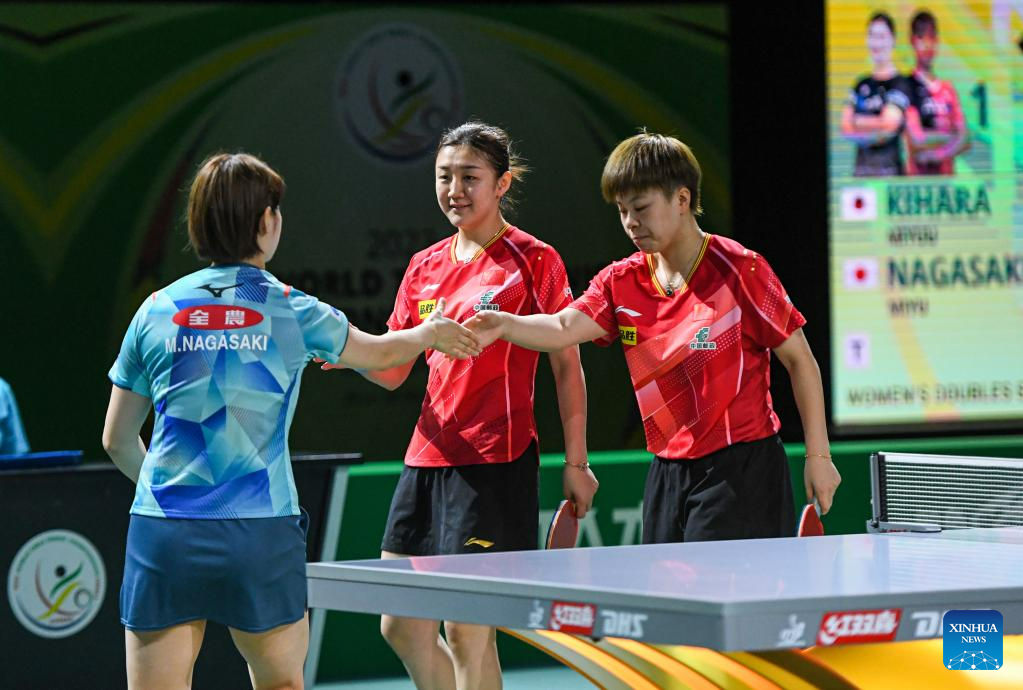 Chen Meng (C)/Wang Yidi (R) of China greet Kihara Miyuu/Nagasaki Miyu (L) of Japan after their women's doubles semifinal at 2023 ITTF Table Tennis World Championships Finals in Durban, South Africa, May 26, 2023. (Xinhua/Li Yahui)
