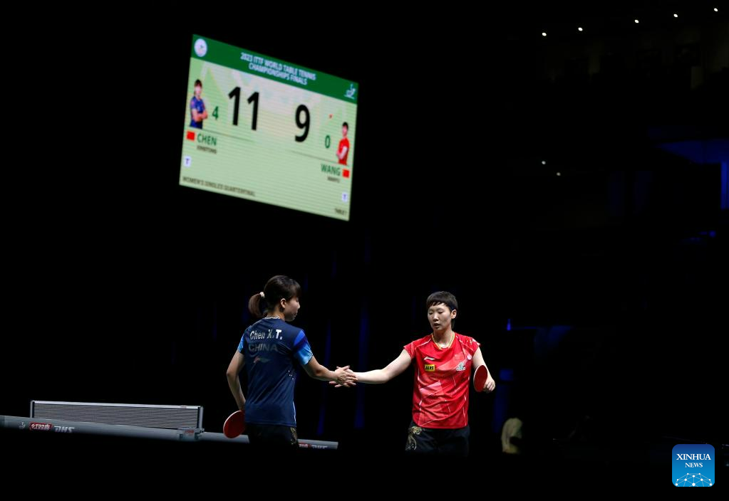 China's Wang Manyu (R) and her compatriot Chen Xingtong shake hands after their women's singles quarterfinal match at 2023 ITTF Table Tennis World Championships Finals in Durban, South Africa, May 26, 2023. (Xinhua/Wang Dongzhen)