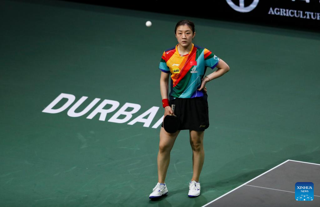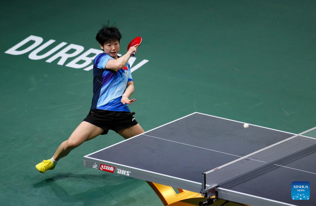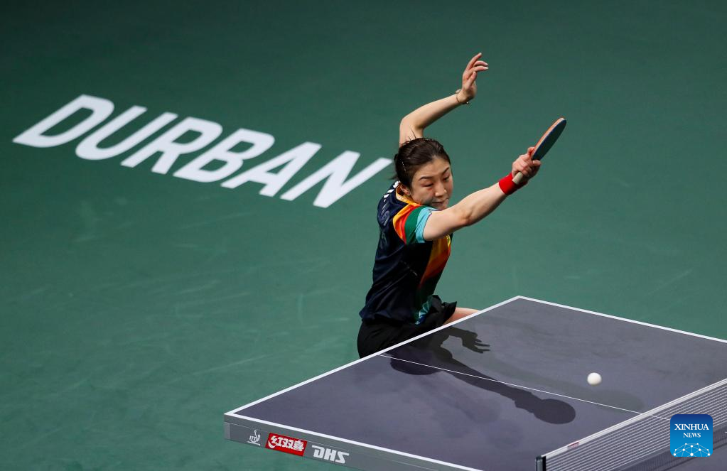Chen Meng of China hits a return during the women's singles final match against her compatriot Sun Yingsha at 2023 ITTF Table Tennis World Championships Finals in Durban, South Africa, May 28, 2023. (Xinhua/Zhang Yudong)