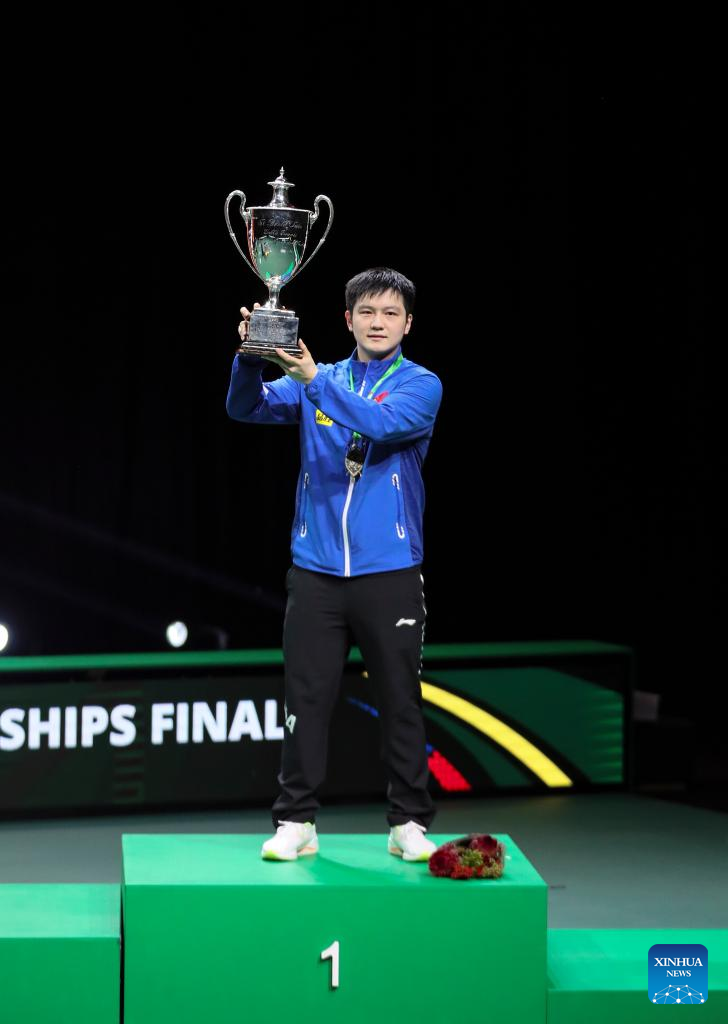 Gold medalist Fan Zhendong of China poses with the trophy during the awarding ceremony for the men's singles final at 2023 ITTF Table Tennis World Championships Finals in Durban, South Africa, May 28, 2023. (Xinhua/Zhang Yudong)