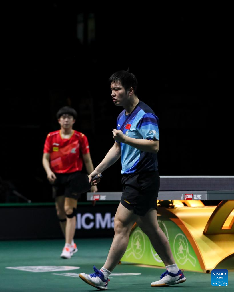 China's Wang Chuqin (L) hits a return during the men's singles final match against his compatriot Fan Zhendong at 2023 ITTF Table Tennis World Championships Finals in Durban, South Africa, May 28, 2023. (Xinhua/Li Yahui)