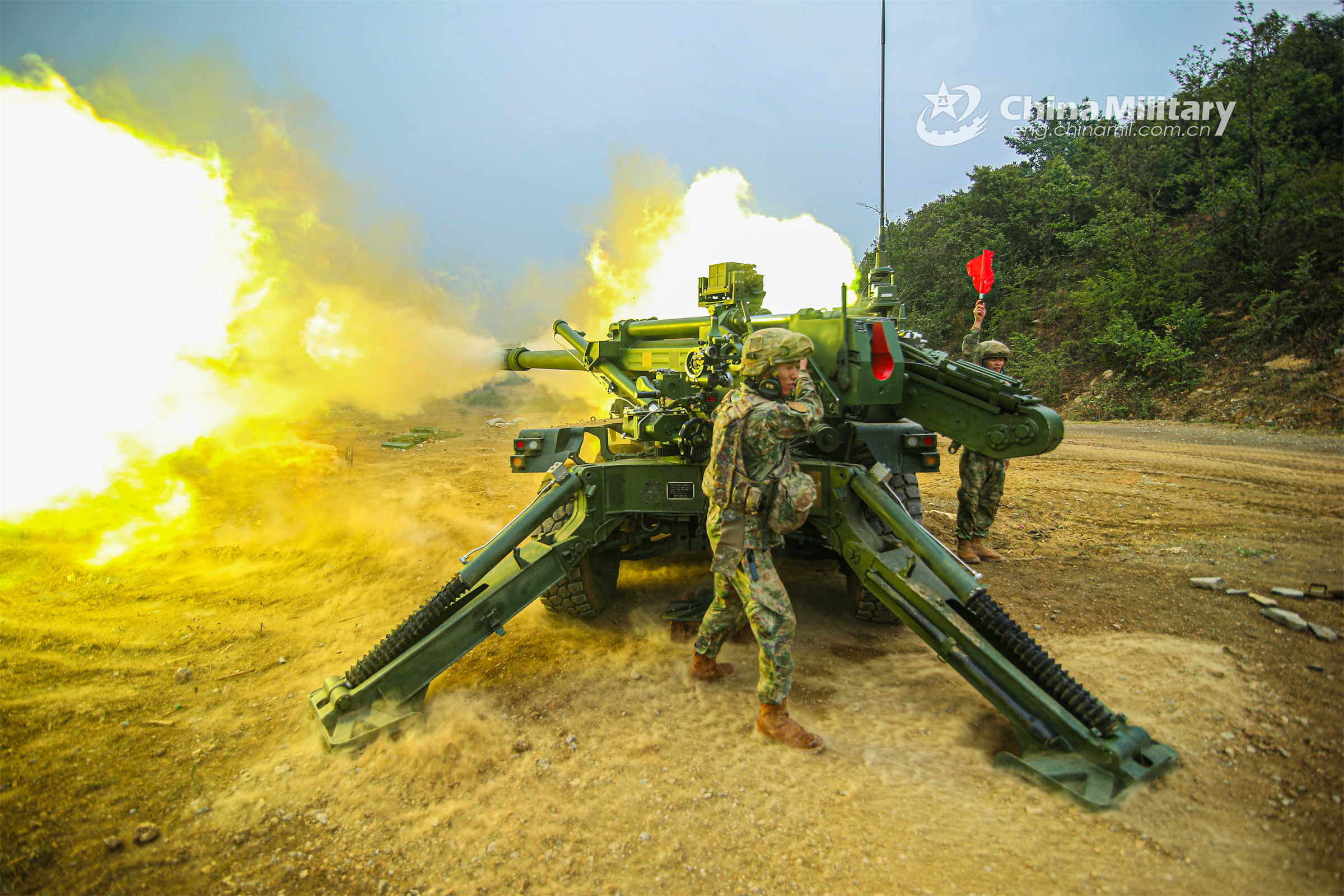 A vehicle-mounted howitzer attached to a combined-arms brigade under the PLA 75th Group Army takes the direct-fire assessment during a live-fire training exercise on May 15, 2023. (eng.chinamil.com.cn/Photo by Li Changqi)