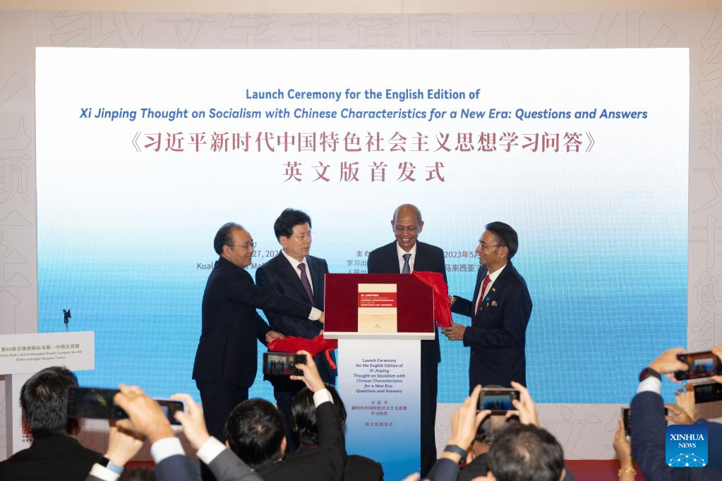 This photo taken on May 27, 2023 shows the launch ceremony for the English edition of "Xi Jinping Thought on Socialism with Chinese Characteristics for a New Era: Questions and Answers" during an event of China as the guest of honor on the 40th Kuala Lumpur International Book Fair in Kuala Lumpur, Malaysia. (Xinhua/Zhu Wei)