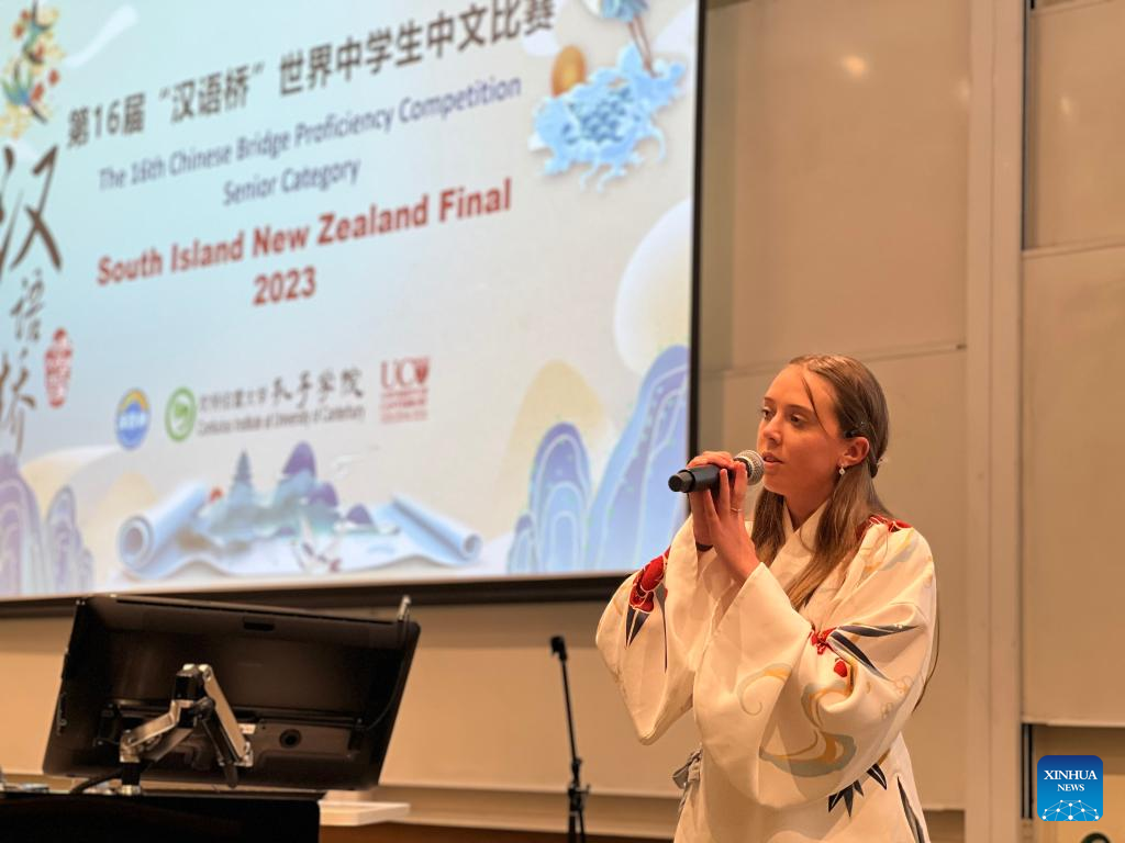 A contestant competes in the annual "Chinese Bridge" Chinese Proficiency Competition in Christchurch, New Zealand's South Island, May 28, 2023. University, secondary and primary school students from across New Zealand's South Island competed for Chinese proficiency in the annual "Chinese Bridge" Chinese Proficiency Competition held on Sunday. (Photo by Walter/Xinhua)
