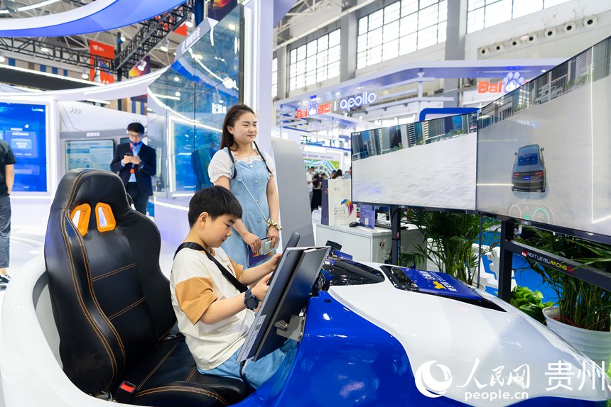 A boy tries a driving simulator at the China International Big Data Industry Expo 2023 in Guiyang, capital of southwest China's Guizhou Province. (People's Daily Online/Tu Min)