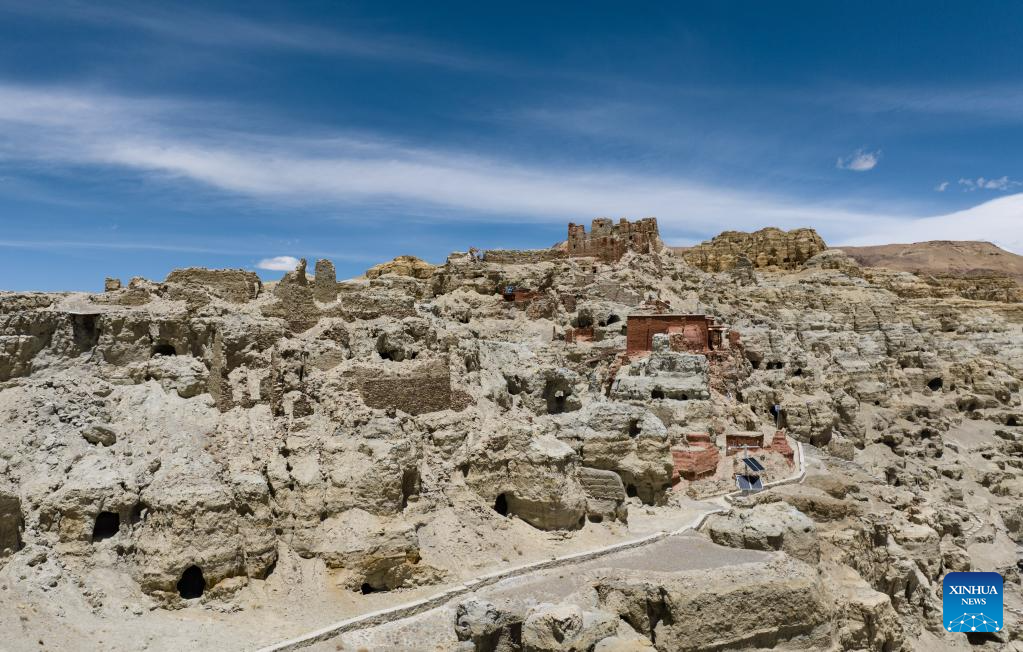 This aerial photo taken on May 26, 2023 shows the Piyang grottoes in Zanda County of Ngari Prefecture, southwest China's Tibet Autonomous Region. (Xinhua/Jigme Dorje)