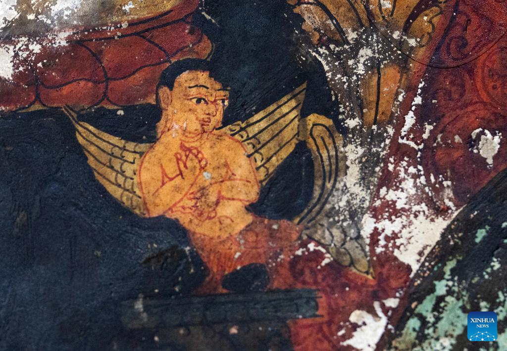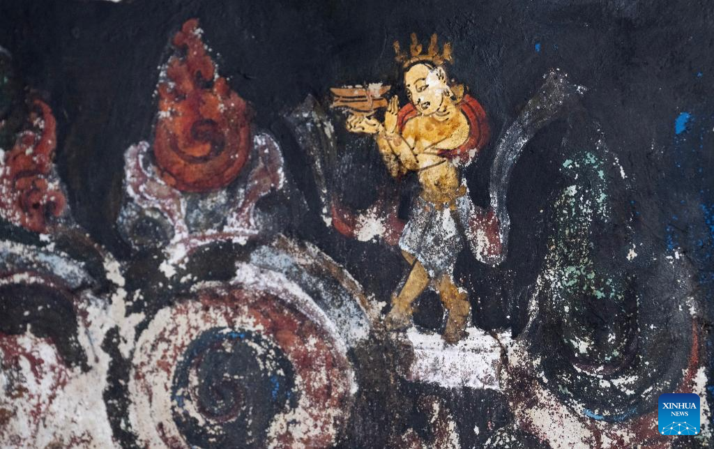 This photo taken on May 26, 2023 shows part of a mural in a grotto in Zanda County of Ngari Prefecture, southwest China's Tibet Autonomous Region. (Xinhua/Fei Maohua)