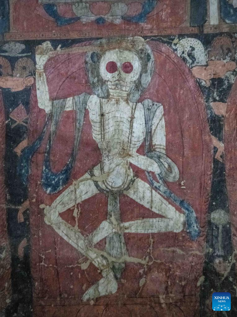This photo taken on May 26, 2023 shows a skeleton in a mural in a grotto in Zanda County of Ngari Prefecture, southwest China's Tibet Autonomous Region. (Xinhua/Jigme Dorje)