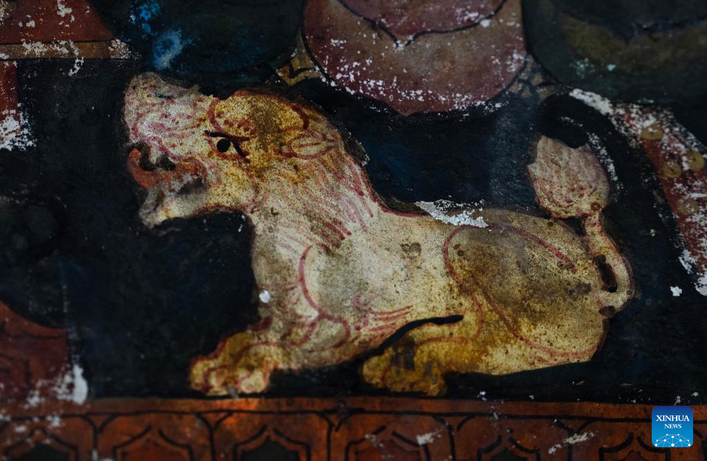This photo taken on May 26, 2023 shows a lion in a mural in a grotto in Zanda County of Ngari Prefecture, southwest China's Tibet Autonomous Region. (Xinhua/Fei Maohua)