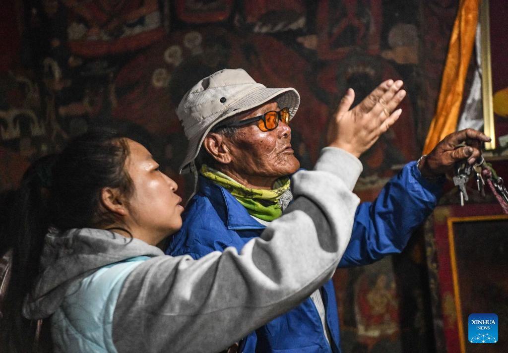 Rigzin Wangzhab, who has been guarding the Donggar and Piyang grottoes for more than 20 years, explains to a tourist as they look at the mural in a grotto in Zanda County of Ngari Prefecture, southwest China's Tibet Autonomous Region, May 26, 2023. (Xinhua/Jigme Dorje)
