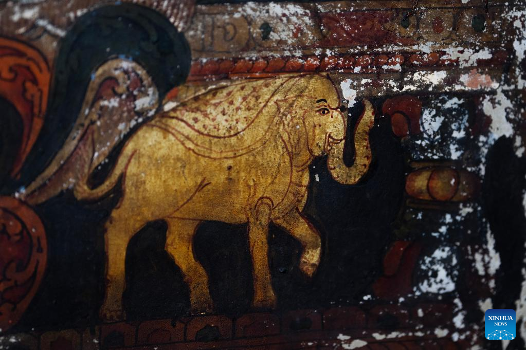 This photo taken on May 26, 2023 shows an elephant in a mural in a grotto in Zanda County of Ngari Prefecture, southwest China's Tibet Autonomous Region. (Xinhua/Fei Maohua)