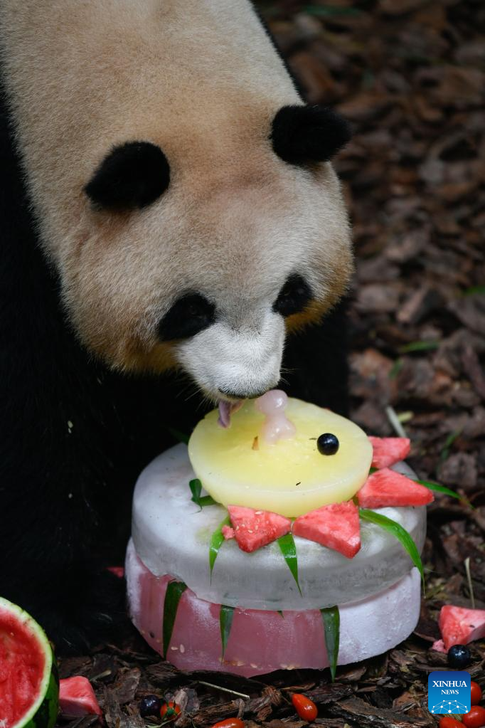 Giant panda Mei Lan eats an ice cake at Chengdu Research Base of Giant Panda Breeding in Chengdu, southwest China's Sichuan Province, May 29, 2023. Giant panda Mei Lan celebrated its 7th birthday at the Chengdu Research Base of Giant Panda Breeding on Monday. (Xinhua/Xu Bingjie)