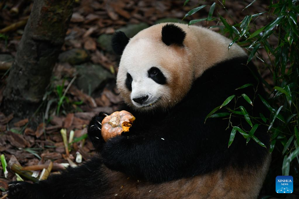 Giant panda Mei Lan eats a pumpkin at Chengdu Research Base of Giant Panda Breeding in Chengdu, southwest China's Sichuan Province, May 29, 2023. Giant panda Mei Lan celebrated its 7th birthday at the Chengdu Research Base of Giant Panda Breeding on Monday. (Xinhua/Xu Bingjie)