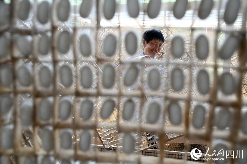 A farmer harvests silkworm cocoons at a sericulture base in Shuangliu village, Dongxing district, Neijiang, southwest China's Sichuan Province. (Photo/Lan Zitao)