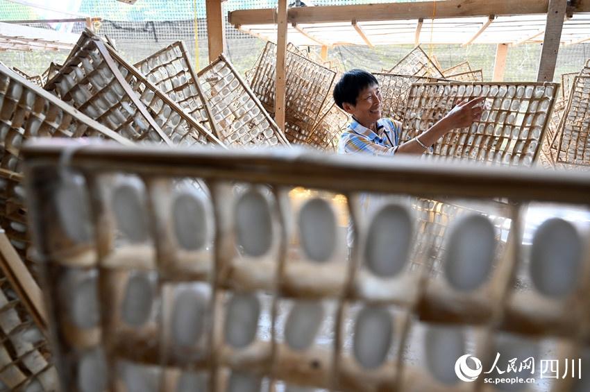 A farmer harvests silkworm cocoons at a sericulture base in Shuangliu village, Dongxing district, Neijiang, southwest China's Sichuan Province. (Photo/Lan Zitao)