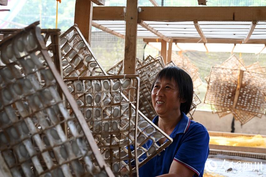 A farmer harvests silkworm cocoons at a sericulture base in Shuangliu village, Dongxing district, Neijiang, southwest China's Sichuan Province. (Photo/Lan Zitao)