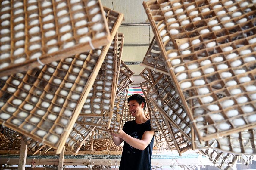 A farmer harvests silkworm cocoons at a sericulture base in Shuangliu village, Dongxing district, Neijiang, southwest China's Sichuan Province. (Photo/Lan Zitao)