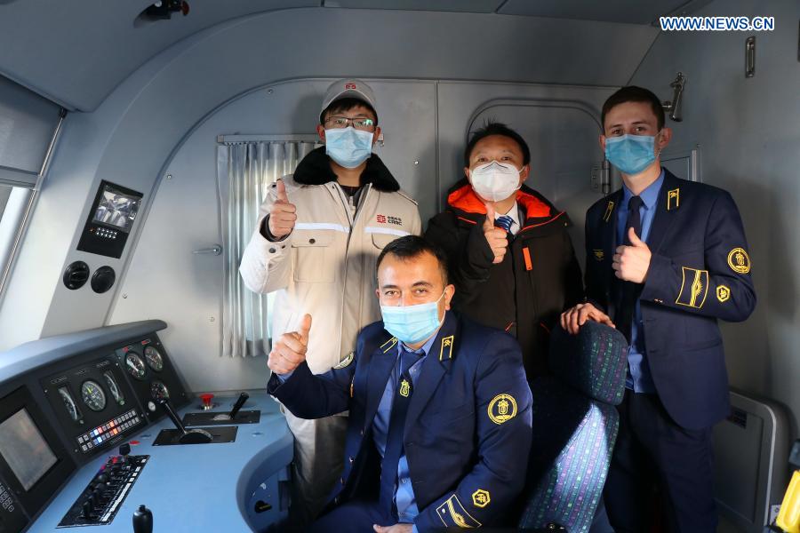 Chinese technicians pose for a photo with Uzbek drivers on an electric locomotive in Tashkent, Uzbekistan, Dec. 17, 2020. (Photo by Zafar Khalilov/Xinhua)