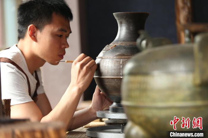 Huang Zijue carves inscriptions on a cultural and creative product. (Photo courtesy of Huang Zijue)