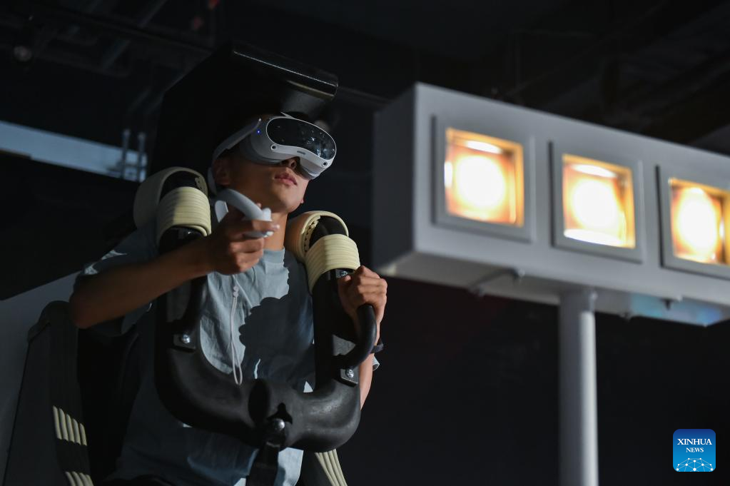 A visitor tries a VR equipment at an exhibition at China Science Fiction Convention (CSFC) 2023 in Beijing, capital of China, May 30, 2023. China Science Fiction Convention (CSFC) 2023 is scheduled to run in Beijing from May 29 to June 4. It is included as a sideline event of this year's Zhongguancun Forum (ZGC Forum) for the first time. Various events such as forums and sci-fi exhibitions are arranged in this year's convention. (Xinhua/Ren Chao)