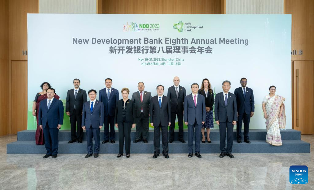 Chinese Vice Premier Ding Xuexiang, also a member of the Standing Committee of the Political Bureau of the Communist Party of China Central Committee, poses for a group photo with heads of foreign delegations attending the opening ceremony of the eighth annual meeting of the New Development Bank (NDB) held in Shanghai, east China, May 30, 2023. Ding addressed the opening ceremony of the bank's eighth annual meeting on Tuesday. (Xinhua/Zhai Jianlan)