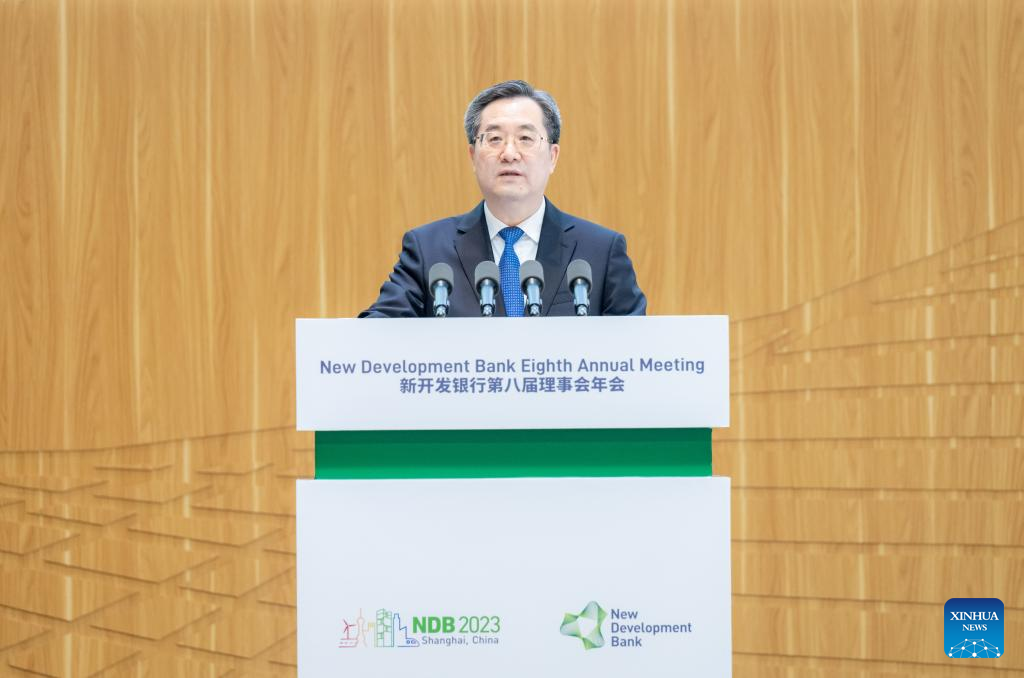 Chinese Vice Premier Ding Xuexiang, also a member of the Standing Committee of the Political Bureau of the Communist Party of China Central Committee, addresses the opening ceremony of the eighth annual meeting of the New Development Bank (NDB) held in Shanghai, east China, May 30, 2023. (Xinhua/Zhai Jianlan)