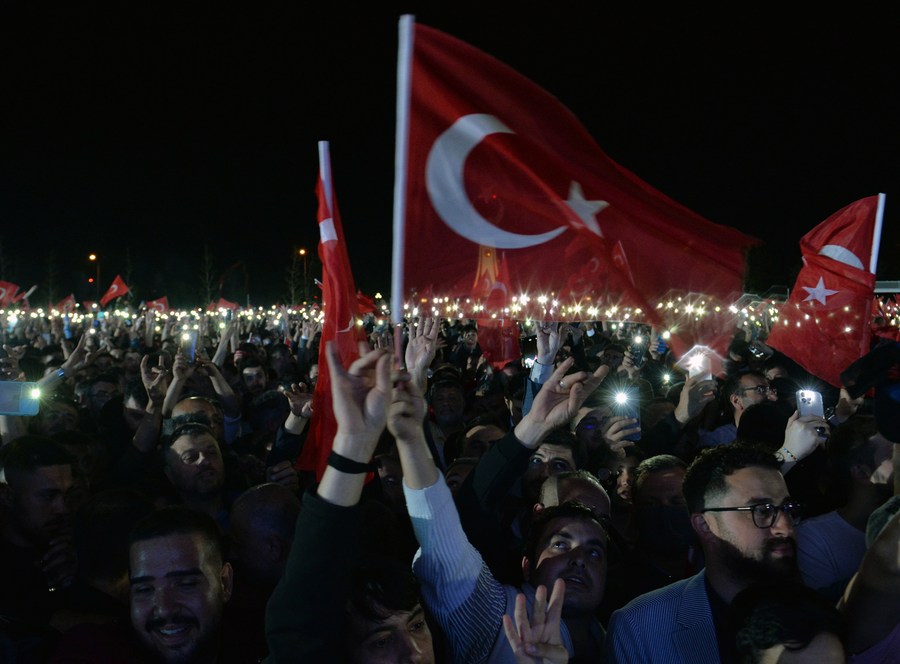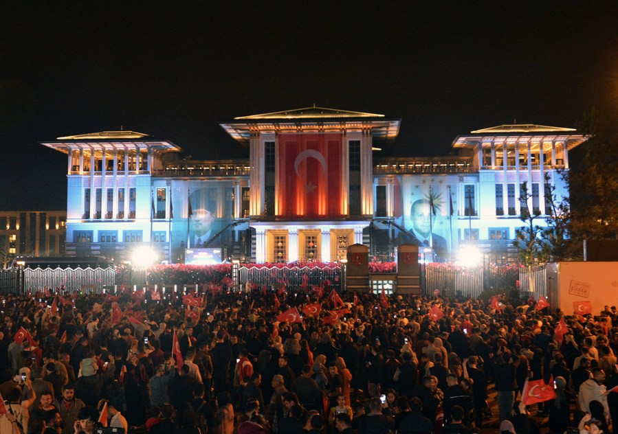 Supporters of Turkish President Recep Tayyip Erdogan celebrate in front of the Turkish Presidential Palace in Ankara, Türkiye, May 28, 2023. (Mustafa Kaya/Handout via Xinhua)