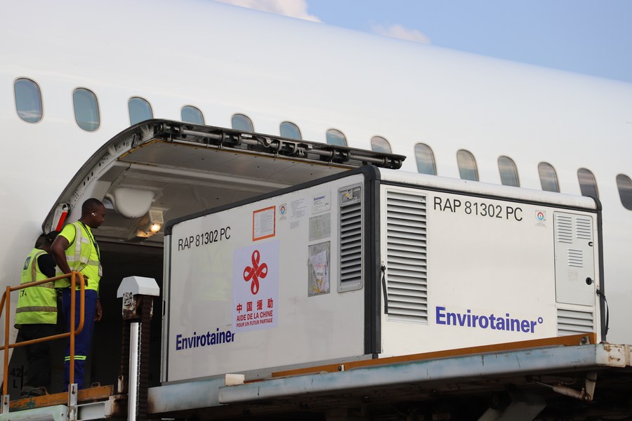 Workers unload a batch of China-donated COVID-19 vaccines at M'poko International Airport in Bangui, Central African Republic, July 6, 2021. (Chinese Embassy in CAR/Handout via Xinhua)